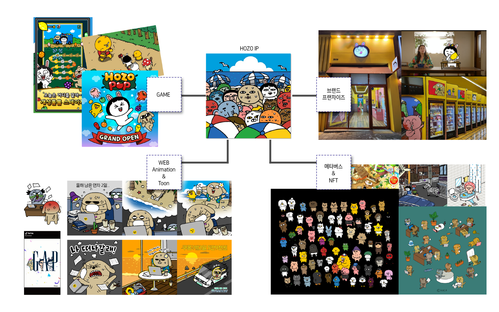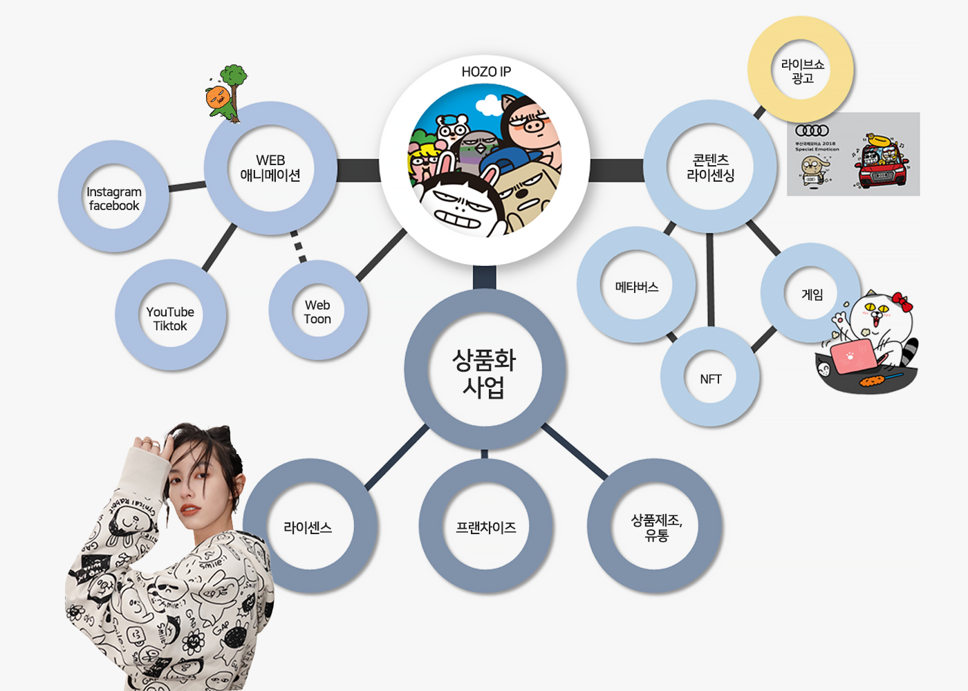 HOZO의 창작 캐릭터IP를 소재로 게임, 애니메이션등의 콘텐츠 제작사업과 캐릭터 상품화 및 라이선싱 사업을 전개해 나가고 있습니다.